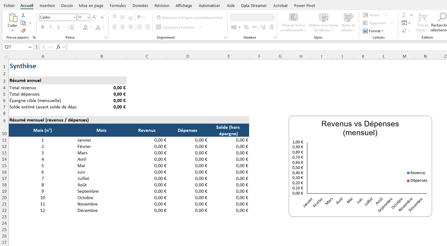 Ce tableau Excel a été conçu pour vous aider à visualiser simplement vos revenus et vos dépenses, mois après mois, sans jargon et sans prise de tête.